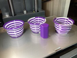 The middle bowl (#2) is the quadrature slicing of the same eleven layers. I alternated the color in each row to produce the checker pattern. There is a purge tower used to clear the nozzle for each color change. It should ne noted the purge tower always needs to be as high as the color changes. The tower is at least four times bigger in diameter than it needs to be just for the purge. This is primarily for stability so it doesn't pop loose from the build plate and doesn't simply fall over.